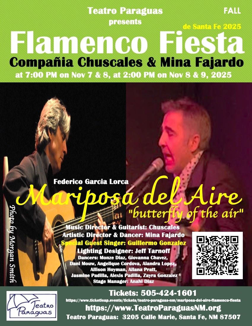 Santa Fe’s acclaimed flamenco ensemble, Compañía Chuscales & Mina Fajardo, presents Mariposa del Aire – Butterfly in the Air, a poetic and urgent flamenco production inspired by Federico García Lorca’s children’s poem and today’s crisis of disappearing butterflies. The work premieres November 7–9, 2025, at Teatro Paraguas, Santa Fe’s bilingual multicultural theater.